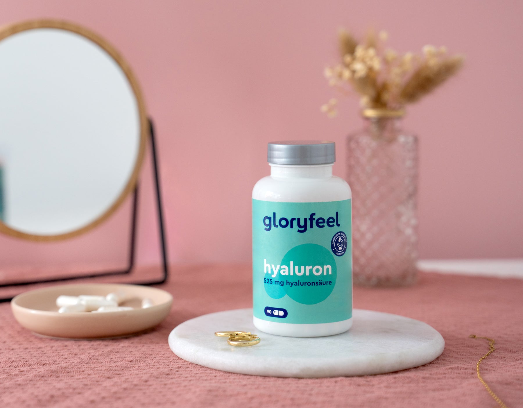 Stay glory, stay young: Vuoi che la tua pelle mantenga il suo splendore? Per il tuo supporto anti-age, ti consigliamo le nostre capsule di acido ialuronico ad alto dosaggio. Grazie alla capsula in softgel e alla forma compatta, le capsule sono particolarmente facili da assumere!