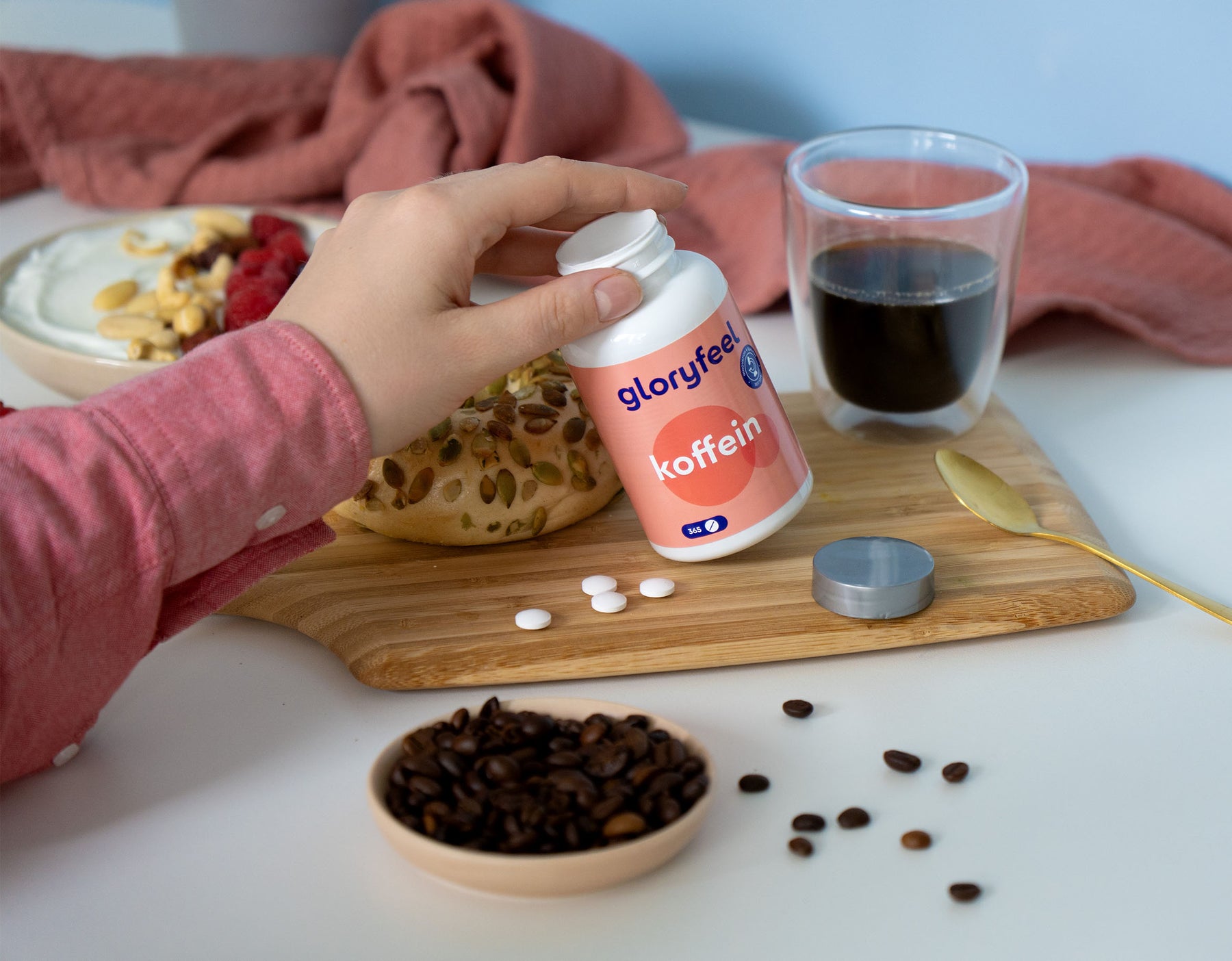 Chi non ama il meraviglioso profumo del caffè appena fatto al mattino? Ma a volte siamo di corsa e serve una carica al volo. Se hai bisogno del potere della caffeina qui e ora: apri la nostra confezione e assumi la caffeina. È così facile con le nostre compresse: perfette per chi è in viaggio, per una rapida dose di energia o per chi non ama il caffè, ma non vuole rinunciare agli effetti della caffeina.