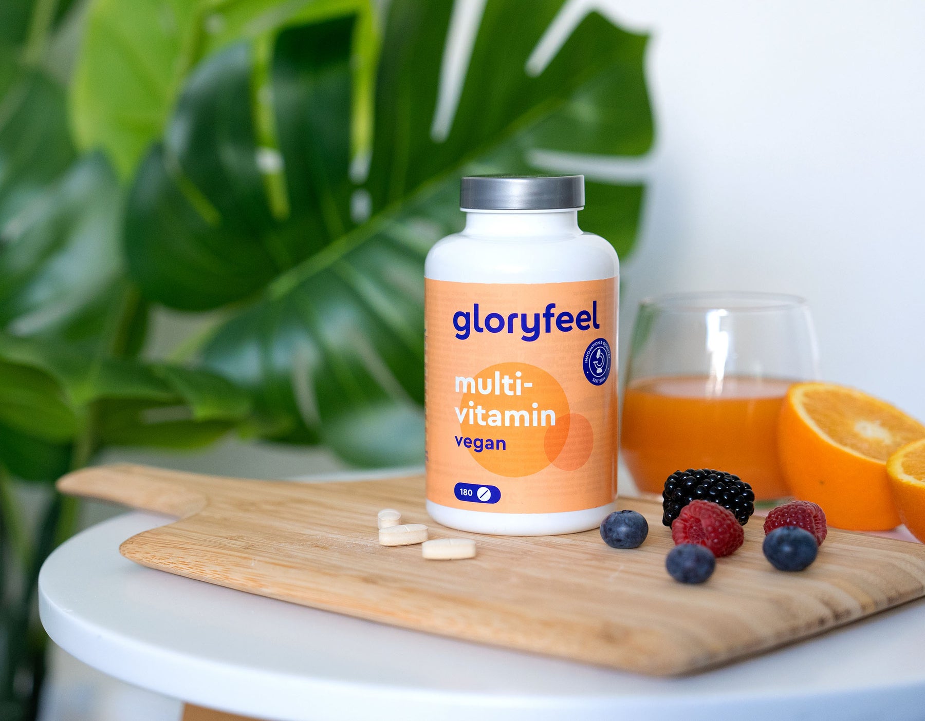 Tutto in uno: le nostre compresse multivitaminiche forniscono preziose vitamine e minerali, per la tua salute e benessere. Con una sola compressa copri il fabbisogno giornaliero di 15 nutrienti essenziali e supporti il tuo organismo in numerose funzioni. E naturalmente è 100% vegan con l'impeccabile qualità gloryfeel.